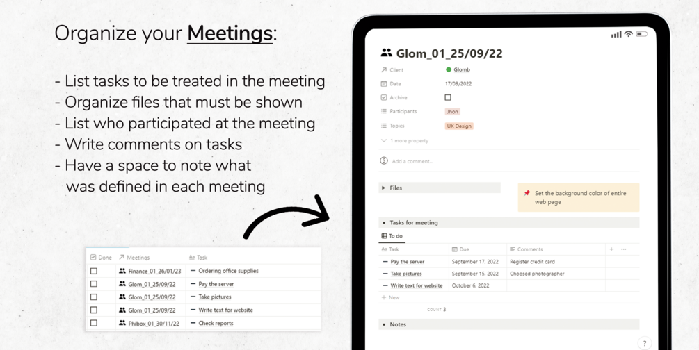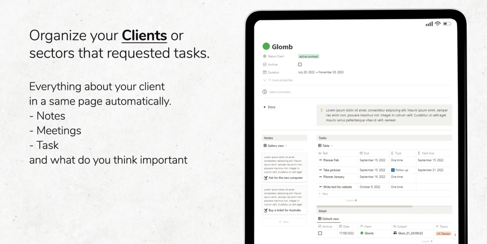 - 4 Databases ( Meetings - Tasks - Clients - Notes)